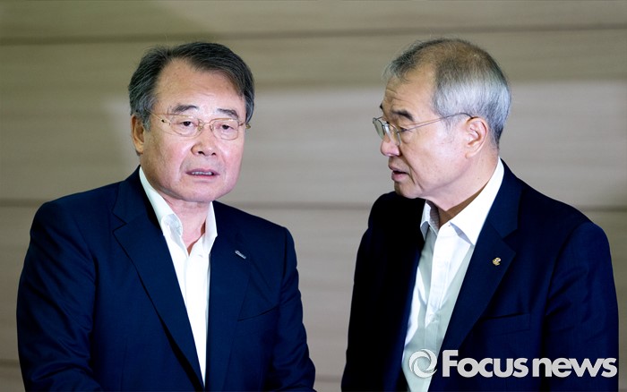(서울=포커스뉴스) 8일 오전 서울 송파구 올림픽파크텔에서 열린 대한체육회 제4차 긴급 임시 이사회에서 강영중(왼쪽) 대한체육회 회장과 조영호 사무총장이 이야기를 나누고 있다. 이번 임시 이사회에서는 박태환의 리우 올림픽 출전 여부가 긴급 안건으로 상정됐다.
