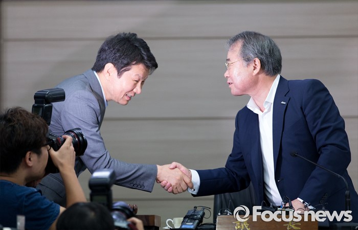 (서울=포커스뉴스) 8일 오전 서울 송파구 올림픽파크텔에서 열린 대한체육회 제4차 긴급 임시 이사회에서 강영중(오른쪽) 대한체육회 회장과 정몽규 리우올림픽 한국선수단장이 악수를 하고 있다. 이번 임시 이사회에서는 박태환의 리우 올림픽 출전 여부가 긴급 안건으로 상정됐다.