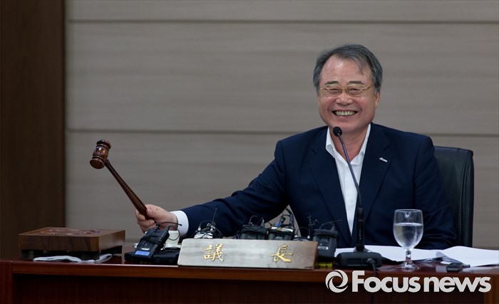 (서울=포커스뉴스) 8일 오전 서울 송파구 올림픽파크텔에서 열린 대한체육회 제4차 긴급 임시 이사회에서 강영중 대한체육회 회장이 의사봉을 두드리고 있다. 이번 임시 이사회에서는 박태환의 리우 올림픽 출전 여부가 긴급 안건으로 상정됐다.