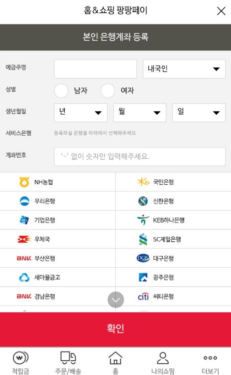 홈앤쇼핑 관계자는 "'팡팡페이'는 현금 이체를 기반으로 해 안전성과 편리성을 동시에 담보한 것이 특징"이라며 "최근 모바일 쇼핑의 활성화로 간편 결제에 대한 고객들의 요구가 다양해지고 있는 점을 감안해 개발했다"고 설명했다.'팡팡페이' 은행계좌번호 입력창.<사진제공=홈앤쇼핑>