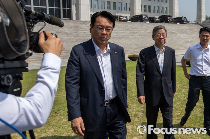 (서울=포커스뉴스) 박근혜 대통령과 새누리당 의원들의 오찬이 예정되있는 8일 오전 서울 여의도 국회에서 김희옥(오른쪽 두 번째) 새누리당 혁신비상대책위원장과 정진석 새누리당 원내대표가 청와대로 이동하는 버스로 향하고 있다.