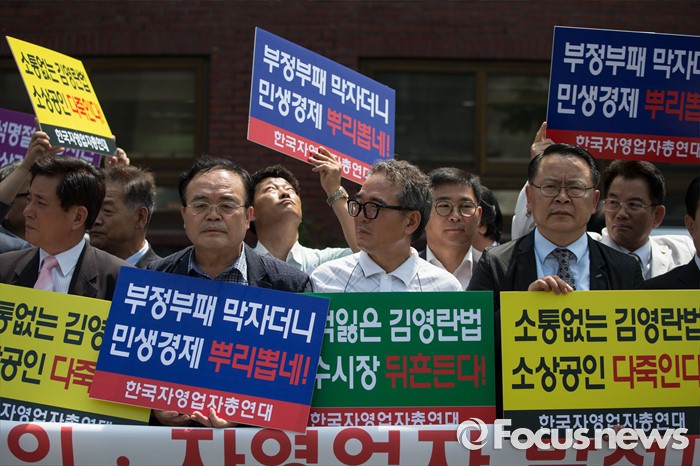 (서울=포커스뉴스) 한국자영업자총연대 등 소상공인 단체가 8일 오전 서울 종로구 효자동주민센터 앞에서 김영란법 시행 저지와 중소상공인 자영업자 발전대책 촉구 공동 기자회견을 하고 있다.