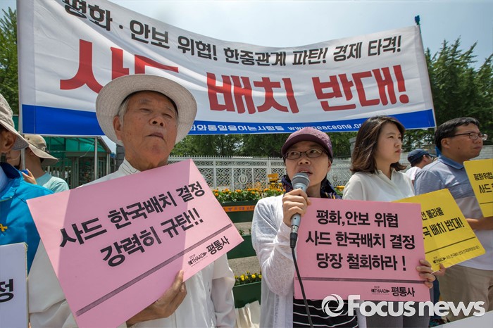 (서울=포커스뉴스) 국방부가 사드의 한국 배치를 결정한 8일 오후 서울 용산구 국방부 앞에서 사드 한국 배치를 규탄하는 평화와 통일을 여는 사람들 관계자들의 시위가 열리고 있다.