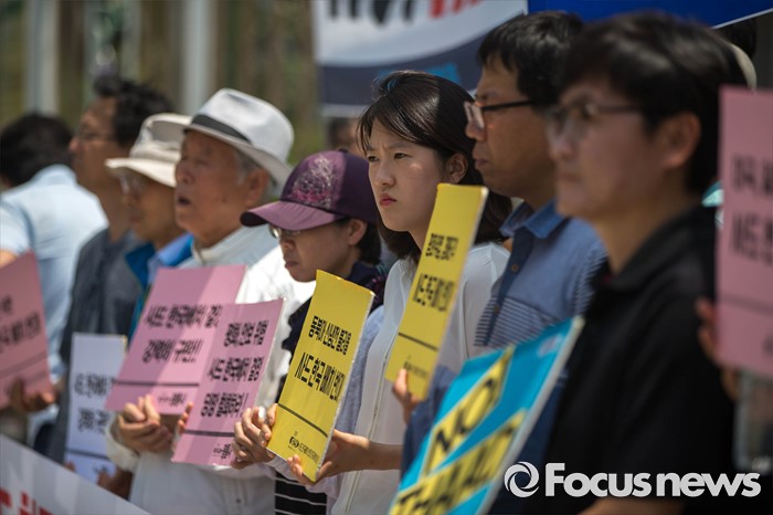 (서울=포커스뉴스) 국방부가 사드의 한국 배치를 결정한 8일 오후 서울 용산구 국방부 앞에서 사드 한국 배치를 규탄하는 평화와 통일을 여는 사람들 관계자들의 시위가 열리고 있다.
