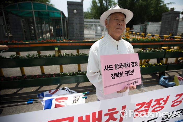(서울=포커스뉴스) 국방부가 사드의 한국 배치를 결정한 8일 오후 서울 용산구 국방부 앞에서 사드 한국 배치를 규탄하는 평화와 통일을 여는 사람들 관계자들의 시위가 열리고 있다.