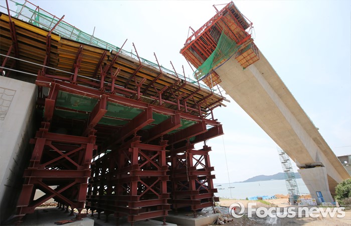 (영광=포커스뉴스) 8일 오전 전남 영광군 염산면과 무안군 해제면을 잇는 칠산대교 건설현장에서 상판 구조물이 무너져 노동자 6명이 부상을 입는 사고가 발생, 칠산대교는 가운데 교각을 중심으로 상판이 한쪽으로 기울듯 무너져 내려 있다.
