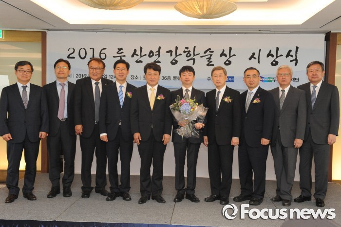 두산연강학술상 의학논문 부문은 한국 의학 발전에 기여하고 젊은 의학 연구자들의 의욕을 고취시키기 위해 2006년 제정됐다.박용현 두산연강재단 이사장(오른쪽 네 번째)이 2016 두산연강학술상 의학논문 부문 수상자인 오상훈 조교수(오른쪽 다섯 번째), 의학계 관계자들과 함께 기념촬영을 하고 있다. <사진제공=두산그룹>