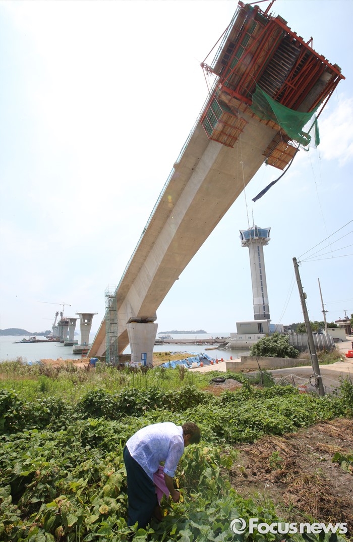 (영광=포커스뉴스) 8일 오전 전남 영광군 염산면과 무안군 해제면을 잇는 칠산대교 건설현장에서 상판 구조물이 무너져 노동자 6명이 부상을 입는 사고가 발생, 칠산대교는 가운데 교각을 중심으로 상판이 한쪽으로 기울듯 무너져 내려 있다.