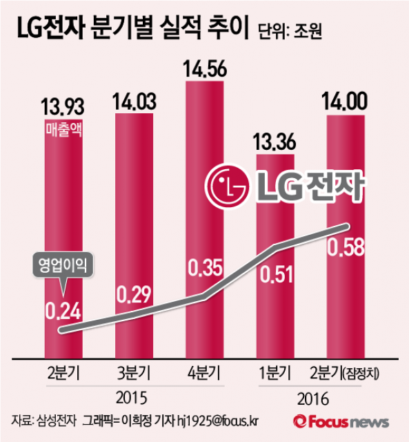 (서울=포커스뉴스) 8일 LG전자가 공시한 올해 2분기 매출액은 14조17억원으로 집계됐다. 영업이익은 5846억원(잠정실적)으로 전년동기비 139.5% 증가했다.