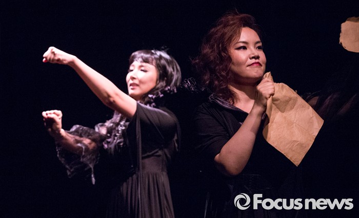 (서울=포커스뉴스) 8일 오후 서울 종로구 동숭아트센터에서 열린 오페라연극 '맥베스' 프레스콜에 참여한 연극배우 서지유(왼쪽)와 소프라노 이보영이 주요장면을 시연하고 있다