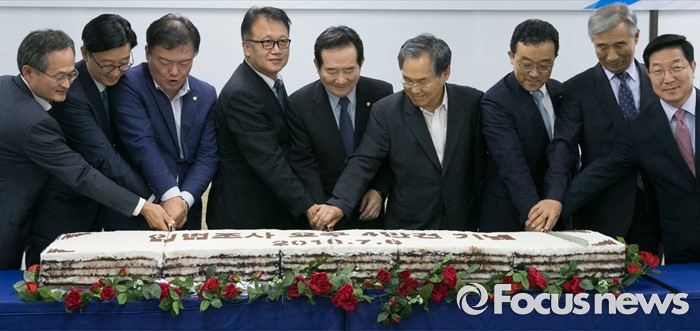 (서울=포커스뉴스) 8일 오후 서울 여의도 국회도서관에서 열린 국회입법조사처 입법조사요구 4만건 돌파 기념식에 참석한 민경욱(왼쪽 세번째부터) 새누리당 의원, 민병두 더불어민주당 의원, 정세균 국회의장, 우윤근 국회 사무총장, 임성호 국회입법조사처장, 이은철 국회도서관장 등 내빈들이 기념떡 컷팅을 하고 있다.