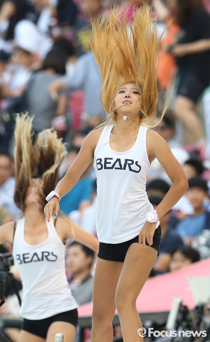 (서울=포커스뉴스) 폭염주의보가 네려진 무더운 8일 저녁 서울 잠실구장에서 열린 2016 프로야구 KIA-두산 경기에서 두산 치어리더가 더위를 날려버릴 시원한 복장으로 졍열적인 춤을 추며 팬들의 이목을 집중시키고 있다.