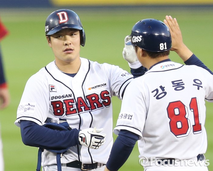 (서울=포커스뉴스) 8일 서울 잠실구장에서 열린 2016 프로야구 KIA-두산 경기 3회말 2사 1,2루에서 두산 민병헌이 중견수 왼쪽으로 떨어지는 2타점 2루타를 치고 강동우 코치의 축하를 받고 있다.