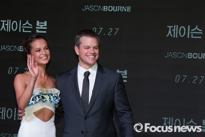 (서울=포커스뉴스) 8일 오후 서울 영등포구 타임스퀘어에서 열린 영화 '제이슨 본' 레드카펫 행사에 참석한 배우 알리시아 비칸데르(왼쪽)과 맷더이먼이 팬들에게 인사를 하고 있다.