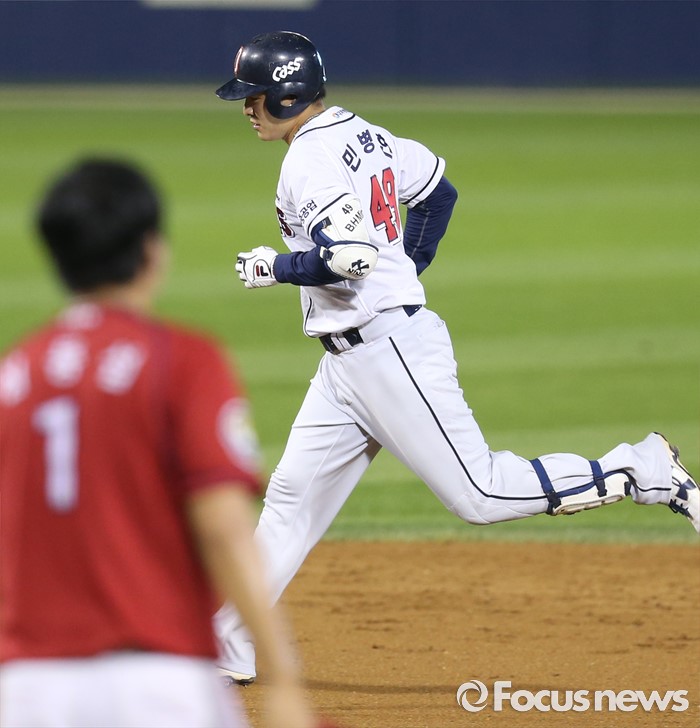 (서울=포커스뉴스) 8일 서울 잠실구장에서 열린 2016 프로야구 KIA-두산 경기 8회말 1사 2루에서 두산 민병헌이 우월 2점 홈런을 치고 그라운드를 돌고 있다.