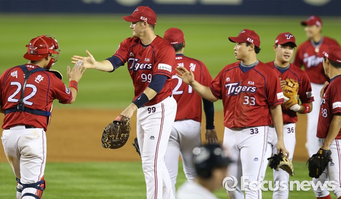 (서울=포커스뉴스) 8일 서울 잠실구장에서 열린 2016 프로야구 KIA-두산 경기에서 두산을 물리친 KIA 선수들이 마운드에 모여 하이파이브하고 있다.