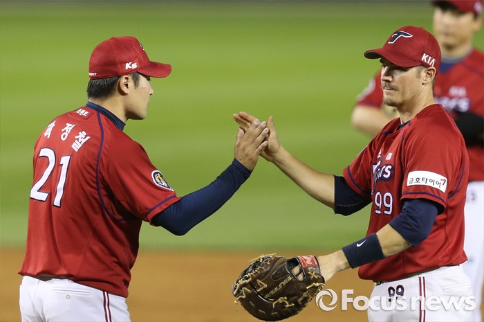(서울=포커스뉴스) 8일 서울 잠실구장에서 열린 2016 프로야구 KIA-두산 경기에서 두산을 물리친 KIA 투수 곽정철과 1루수 필이 하이파이브하고 있다.