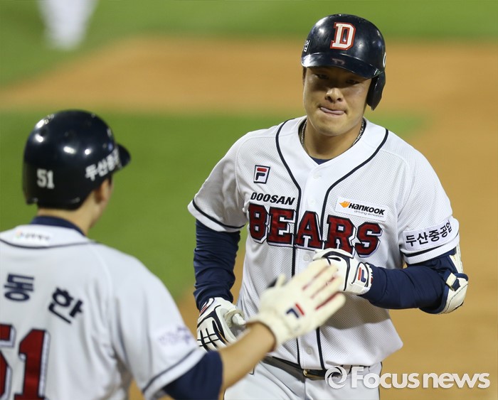 (서울=포커스뉴스) 8일 서울 잠실구장에서 열린 2016 프로야구 KIA-두산 경기 8회말 1사 2루에서 두산 민병헌이 우월 2점 홈런을 치고 선행주자 딤동한의 환영을 받으며 홈인하고 있다.
