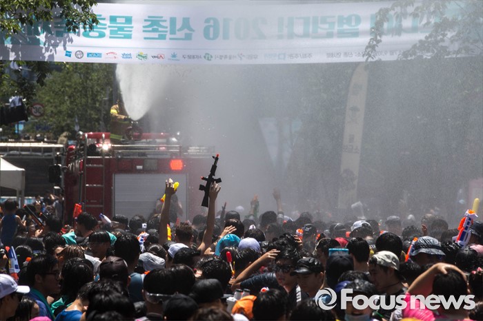 (서울=포커스뉴스) 9일 오후 서울 서대문구 신촌 연세로에서 열린 '2016 물총축제' 에 참가한 시민들이 서로 물총을 쏘며 즐거운 시간을 보내고 있다.