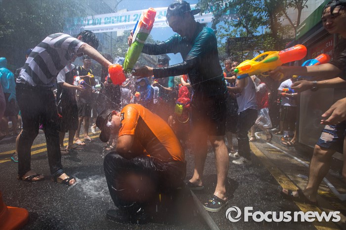 (서울=포커스뉴스) 9일 오후 서울 서대문구 신촌 연세로에서 열린 '2016 물총축제' 에서 시민들이 한 소방대원대원을 향해 물을 뿌리고 있다.