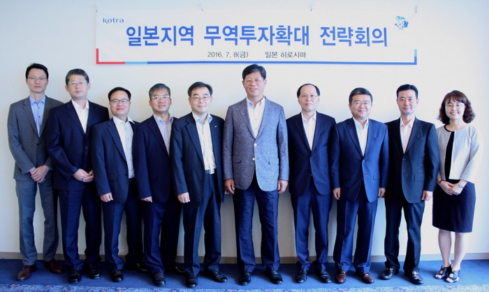 김재홍 코트라 사장은 "상반기에 포착한 시장별 기회요인을 바탕으로 하반기에는 성과 창출에 전사적 역량을 결집하겠다"고 말했다.김재홍 코트라 사장(오른쪽 5번째)과 지역 무역관장들이 일본 히로시마에서 열린 무역투자확대전략회의 후 기념사진을 촬영하고 있다. <사진제공=코트라>