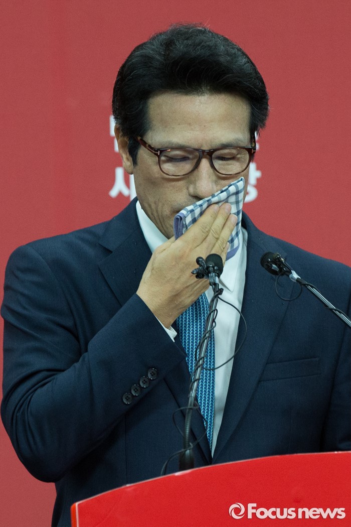 (서울=포커스뉴스) 10일 오전 서울 영등포구 새누리당 당사에서 정병국 새누리당 의원이 당대표 출마 기자회견에서 땀을 닦고 있다.