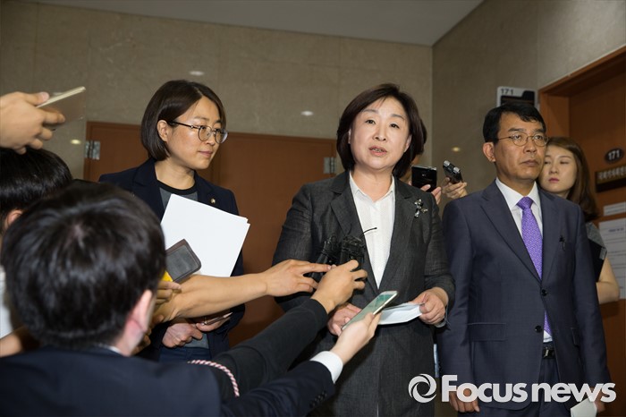 (서울=포커스뉴스) 10일 오전 서울 영등포구 국회에서 심상정 정의당 삼임대표가 사드 배치 관련 긴급기자회견을 마친 뒤 브리핑실 밖에서 취재진의 질문을 받고 있다.