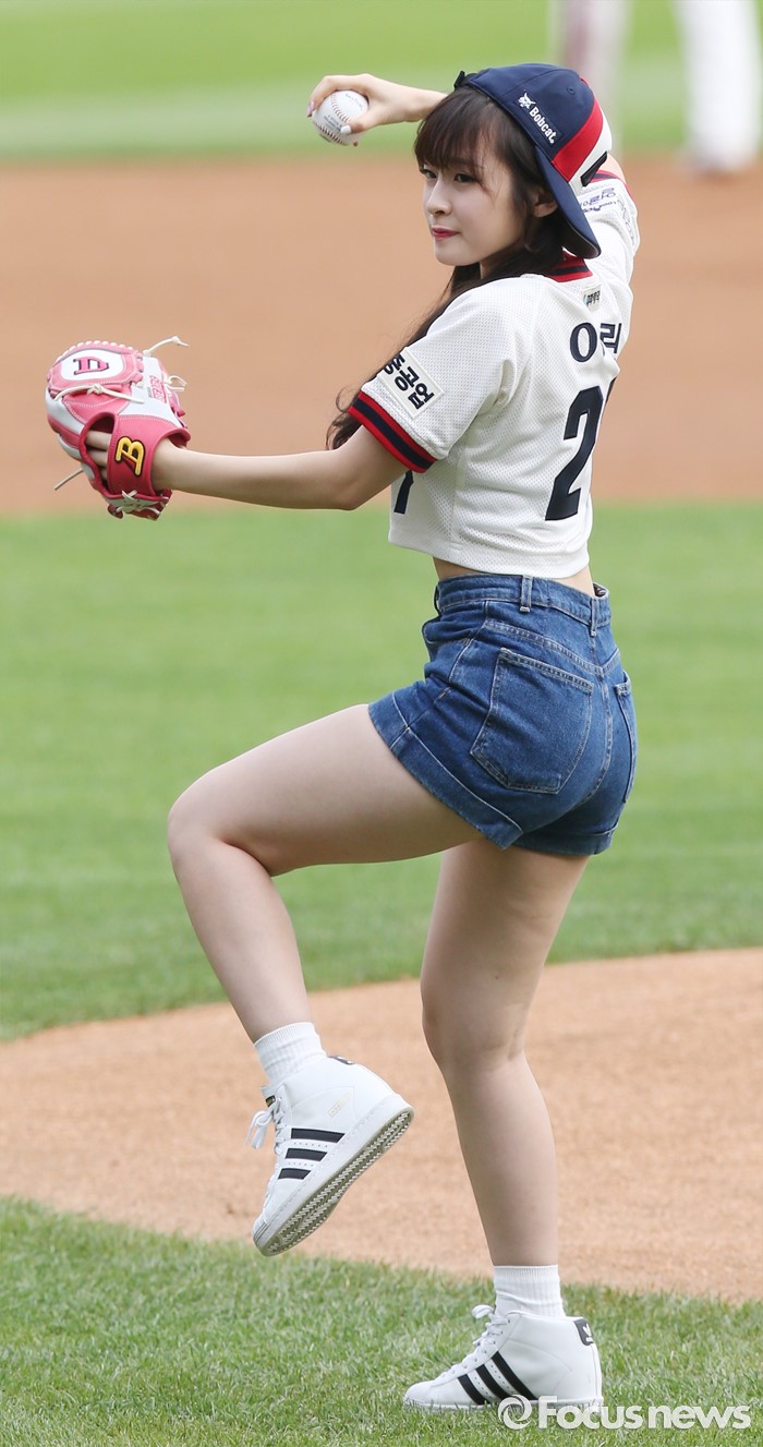 (서울=포커스뉴스) 10일 서울 잠실구장에서 열린 2016 프로야구 넥센-두산 경기에 앞서 걸그룹 '오마이걸'의 아린이 시구하고 있다.