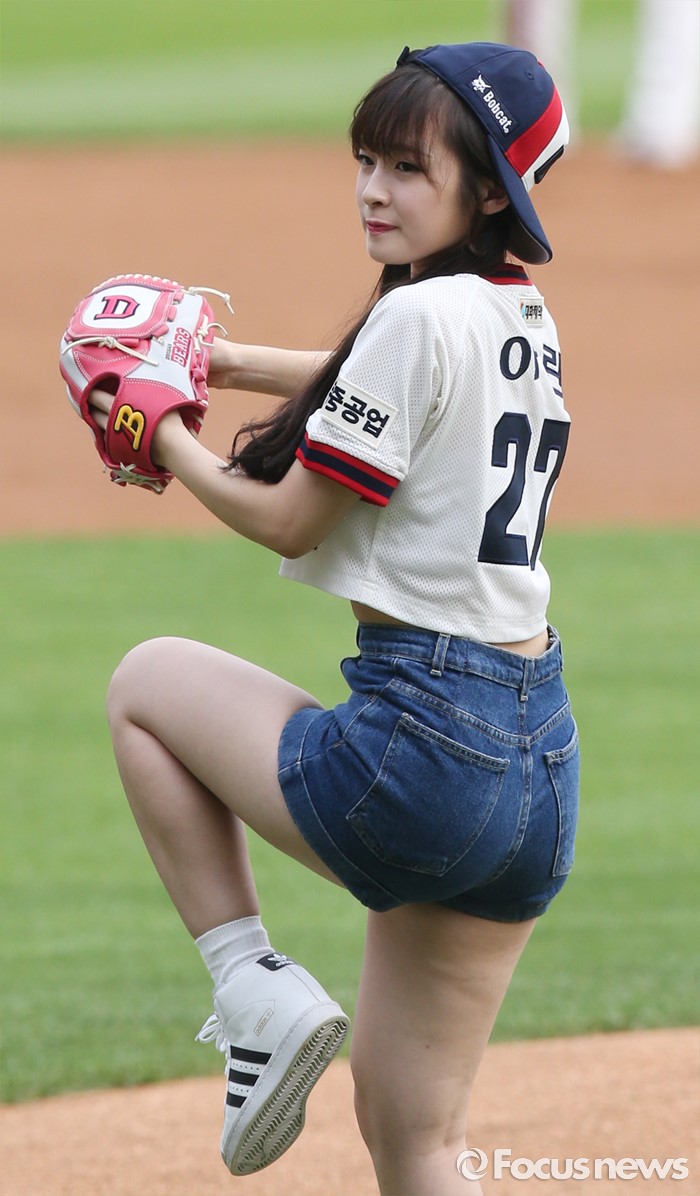 (서울=포커스뉴스) 10일 서울 잠실구장에서 열린 2016 프로야구 넥센-두산 경기에 앞서 걸그룹 '오마이걸'의 아린이 시구하고 있다.