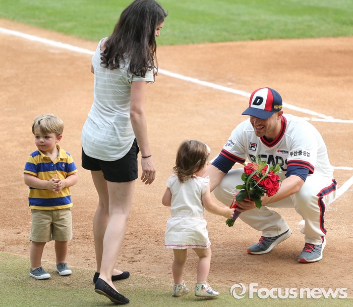 (서울=포커스뉴스) 10일 서울 잠실구장에서 열린 2016 프로야구 KIA-두산 경기에 앞서 가진 두산 투수 보우덴의 노히트노런 기록 달성 시상식에서 보우덴의 가족이이 꽃다발을 전달하고 있다.
