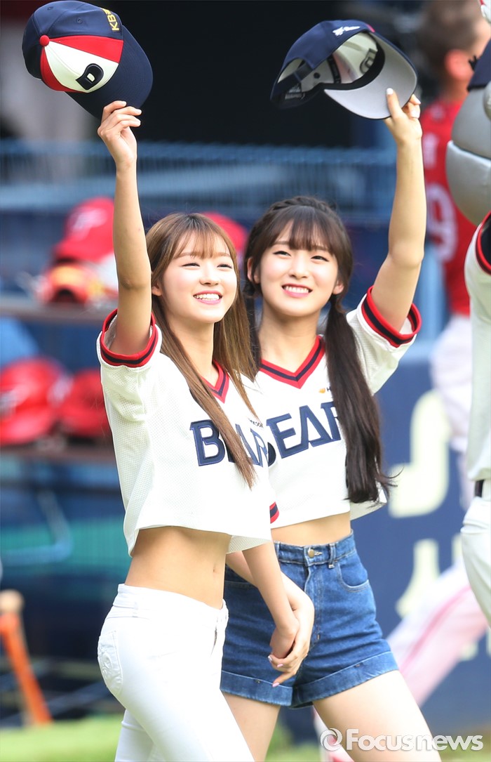(서울=포커스뉴스) 10일 서울 잠실구장에서 열린 2016 프로야구 넥센-두산 경기에 앞서 걸그룹 '오마이걸'의 아린(오른쪽)과 유아가 시구, 시타를 위해 그라운드로 나오며 모자를 흔들며 관중에게 인사하고 있다.