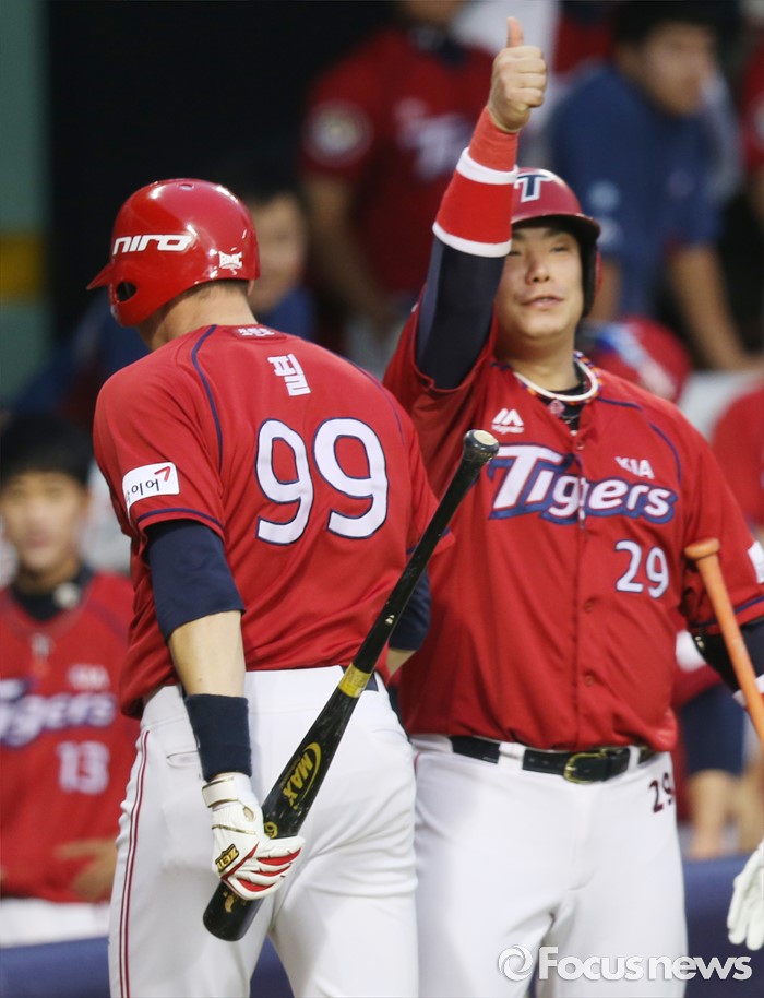 (서울=포커스뉴스) 10일 서울 잠실구장에서 열린 2016 프로야구 KIA-두산 경기 5회초 2사 1루에서 KIA 나지완이 홈런을 치고 들어오는 브렛 필을 환영하며 엄지손가락을 치켜들고 있다.