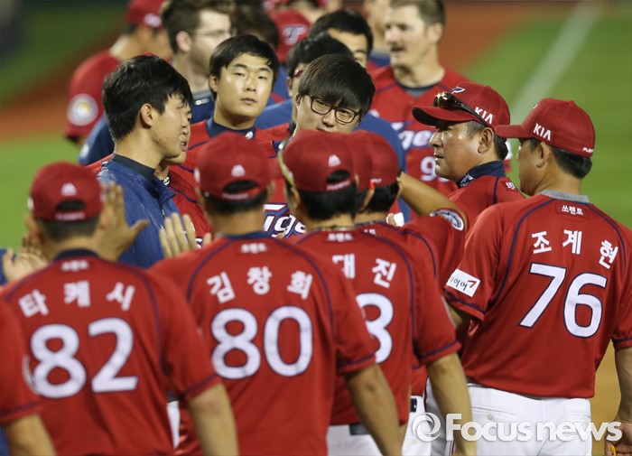 (서울=포커스뉴스) 10일 서울 잠실구장에서 열린 2016 프로야구 KIA-두산 경기를 마치고 KIA 김기태 감독이 두산에 선발승을 한 투수 홍건희를 축하해 주고 있다.