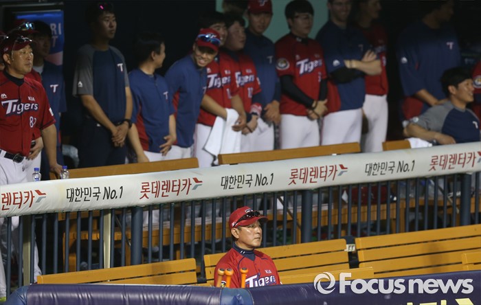 (서울=포커스뉴스) 10일 서울 잠실구장에서 열린 2016 프로야구 KIA-두산 경기 9회말에 KIA 김기태 감독이 덕아웃 맨 앞자리에 앉아 경기를 지켜보고 있다.