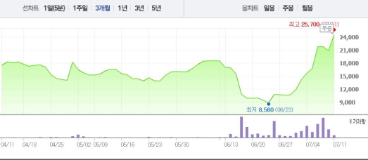 이두현 박사는 ‘일라이릴리’, ‘존슨앤존슨’, ‘암젠’ 등 미국 대형 글로벌 제약사에서 신약개발 경험을 쌓은 전문가다.주가흐름<사진출처=네이버 캡쳐>