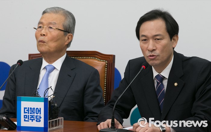 (서울=포커스뉴스) 11일 오전 서울 여의도 국회에서 열린 더불어민주당 비상대책위원회의에 참석한 우상호(오른쪽) 원내대표가 발언하고 있다.