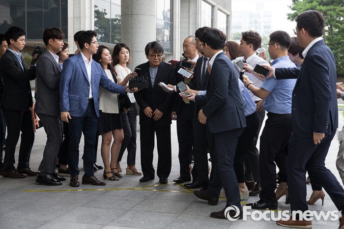 (서울=포커스뉴스) '대우조선 비자금 조성' 의혹을 받고 있는 남상태 전 사장의 최측근 유명 건축가 이창하(가운데)가 11일 오전 서울 서초구 서울중앙지방검찰청으로 들어서기 전 취재진의 질문에 답하고 있다.