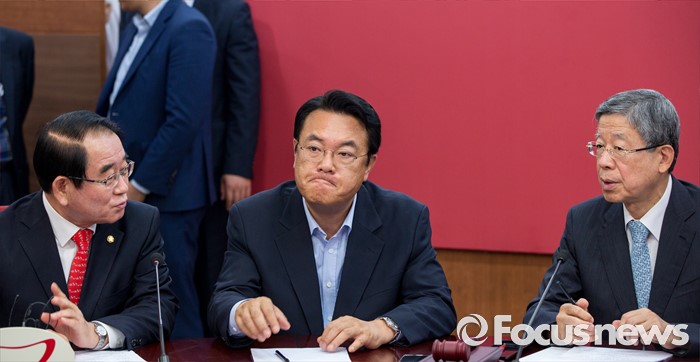 (서울=포커스뉴스) 김희옥(오른쪽) 새누리당 혁신비상대책위원장과 박명재(왼쪽) 사무총장이 11일 오전 서울 여의도 새누리당사에서 열린 혁신비상대책위원회의에 참석해 대화 하고 있다.
