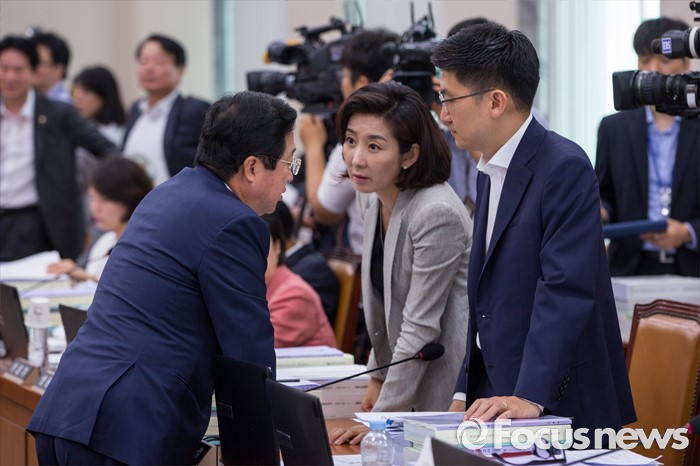 (서울=포커스뉴스) 국회 교육문화체육관광위원회 새누리당 소속 간사 이장우(왼쪽) 의원이 11일 오전 서울 여의도 국회에서 열린 교육문화체육관광위원회 전체회의에 참석해 '개돼지 발언 논란'을 일으킨 나향욱 교육부 정책기획관에 대한 출석 요구 공방에 정회가 선포된 뒤 나경원(가운데) 의원, 김세연 의원과 대화 하고 있다.