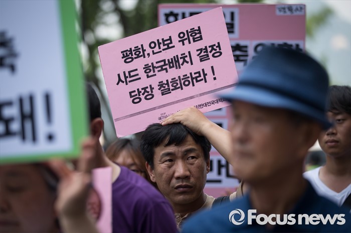 (서울=포커스뉴스) '평화와 통일을 여는 사람들' 관계자 및 사드 한국 배치를 반대하는 시민들이 11일 오전 서울 종로구 창조경제 혁신센터 앞에서 사드 한국 배치 결정 철회 촉구 기자회견을 하고 있다.