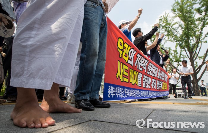 (서울=포커스뉴스) 11일 오전 서울 종로구 정부서울청사 정문 앞에서 열린 사드 배치 환영 기자회견에 참석한 보수단체 회원들이 사드 반대 세력을 규탄하는 구호를 외치고 있다.