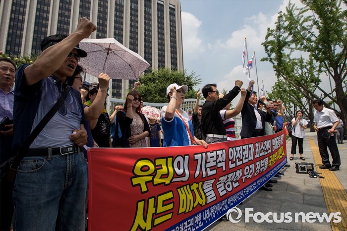(서울=포커스뉴스) 11일 오전 서울 종로구 정부서울청사 정문 앞에서 열린 사드 배치 환영 기자회견에 참석한 보수단체 회원들이 사드 반대 세력을 규탄하는 구호를 외치고 있다.