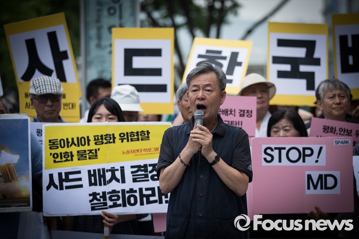 (서울=포커스뉴스) '평화와 통일을 여는 사람들' 관계자 및 사드 한국 배치를 반대하는 시민들이 11일 오전 서울 종로구 창조경제 혁신센터 앞에서 사드 한국 배치 결정 철회 촉구 기자회견을 하고 있다.