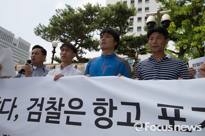 (서울=포커스뉴스) 11일 오전 서울 서초구 대검찰청 앞에서 사건의 피해자와 유가족들이 '삼례 나라슈퍼 3인조 강도치사 사건' 진정서 제출 기자회견을 하고 있다.
