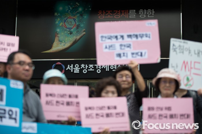(서울=포커스뉴스) '평화와 통일을 여는 사람들' 관계자 및 사드 한국 배치를 반대하는 시민들이 11일 오전 서울 종로구 창조경제 혁신센터 앞에서 사드 한국 배치 결정 철회 촉구 기자회견을 하고 있다.