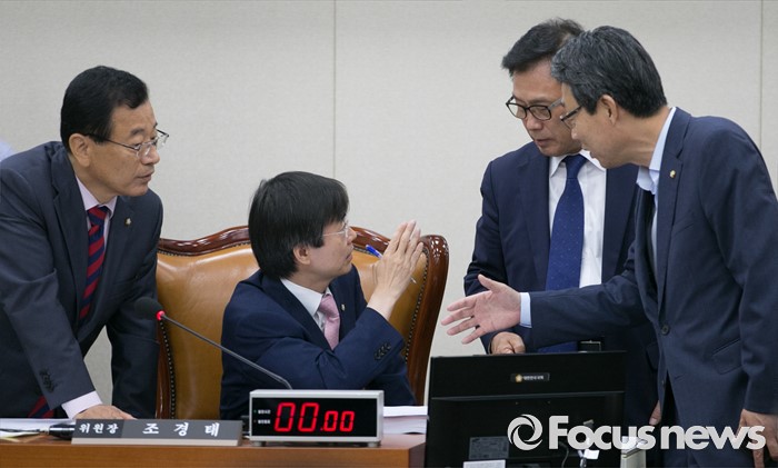 (서울=포커스뉴스) 11일 오전 서울 여의도 국회에서 열린 기획재정위원회 전체회의에 참석한 조경태 위원장과 3당 간사가 대화하고 있다. 왼쪽부터 이현재 새누리당 간사, 조 위원장, 박광온 더불어민주당 간사, 김성식 국민의당 간사.