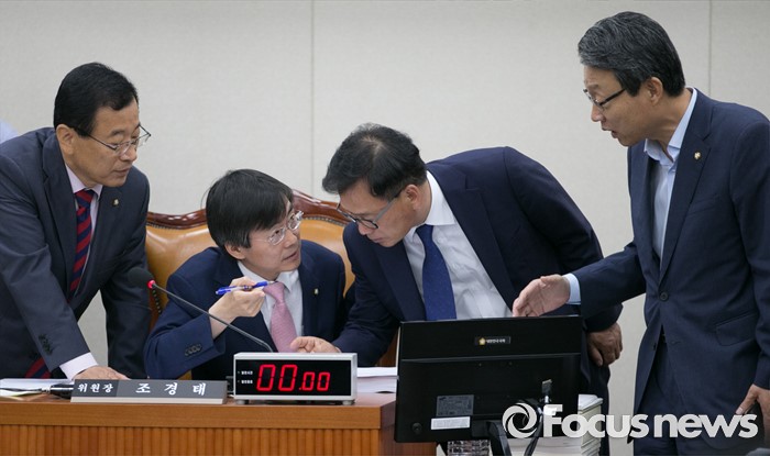 (서울=포커스뉴스) 11일 오전 서울 여의도 국회에서 열린 기획재정위원회 전체회의에 참석한 조경태 위원장과 3당 간사가 대화하고 있다. 왼쪽부터 이현재 새누리당 간사, 조 위원장, 박광온 더불어민주당 간사, 김성식 국민의당 간사.