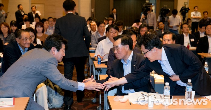 (서울=포커스뉴스) 11일 오후 서울 여의도 중소기업중앙회관에서 열린 새누리당 전국원외위원장협의회 전체회의에 전당대회 출마를 선언한 강석호(왼쪽), 김용태(오른쪽) 의원과 김기선 제1사무부총장이 인사를 하고 있다.
