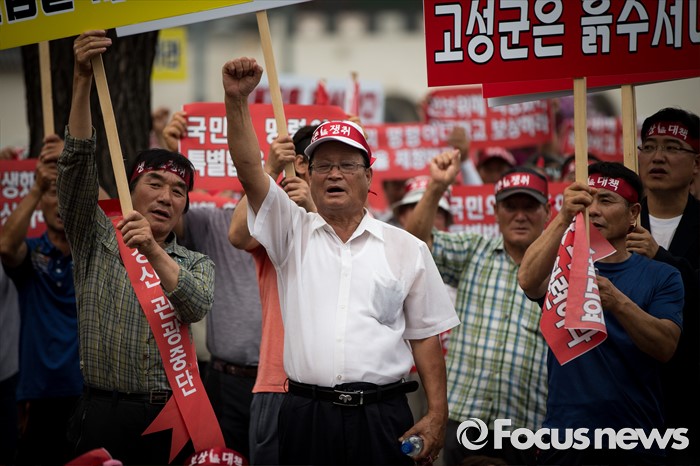 (서울=포커스뉴스) 금강산관광 중단 8년째를 맞아 금강산관광 중단 피해대응 고성군 추진위원회 회원들이 11일 오후 서울 종로구 서울정부청사앞에서 지원대책 마련을 촉구하며 구호를 외치고 있다.