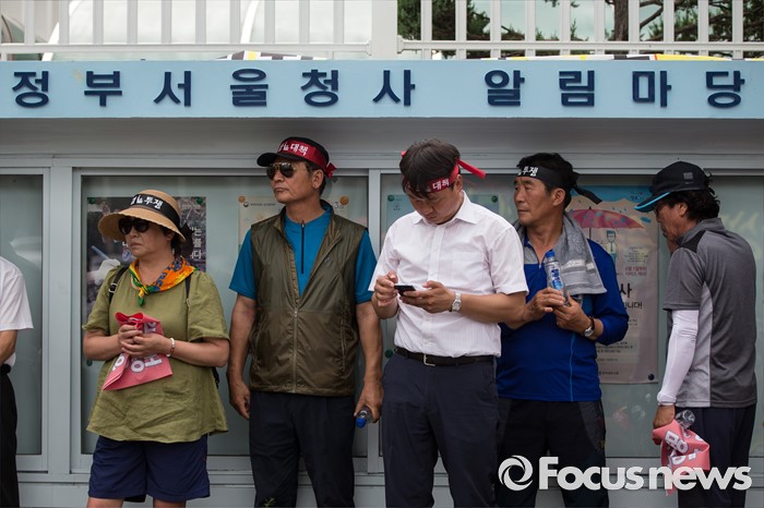 (서울=포커스뉴스) 금강산관광 중단 8년째를 맞아 금강산관광 중단 피해대응 고성군 추진위원회 회원들이 11일 오후 서울 종로구 서울정부청사앞에서 지원대책 마련을 촉구하며 집회를 갖고 있다.
